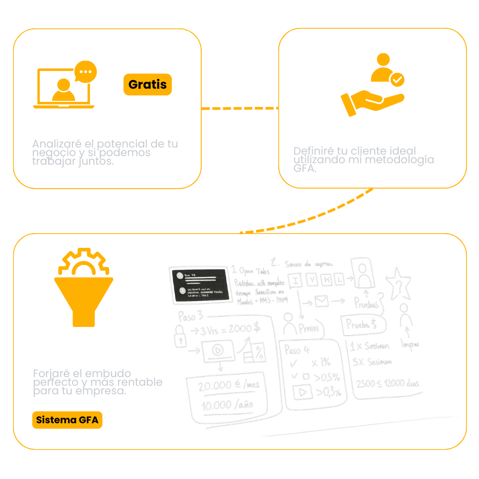 Con un ticket medio de +5.000€, llenamos su calendario de llamadas con prospectos cualificados. Eso mismo puedo hacerlo contigo: llenar tu agenda de llamadas cualificadas y llevarte a facturar +100.000€/mes con el Sistema G.F.A.